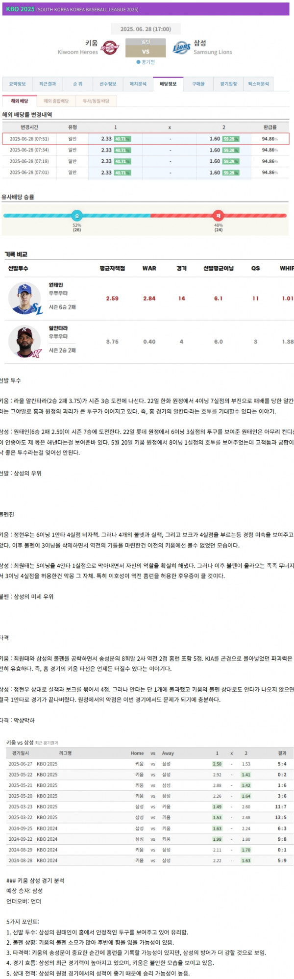 KBO 키움 vs 삼성 정보~