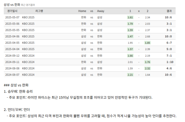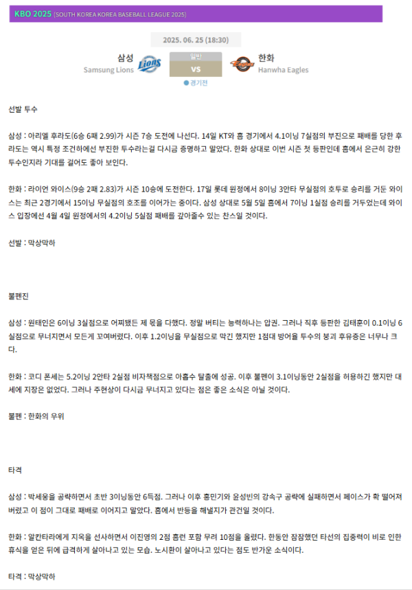 KBO 삼성 vs 한화 정보~